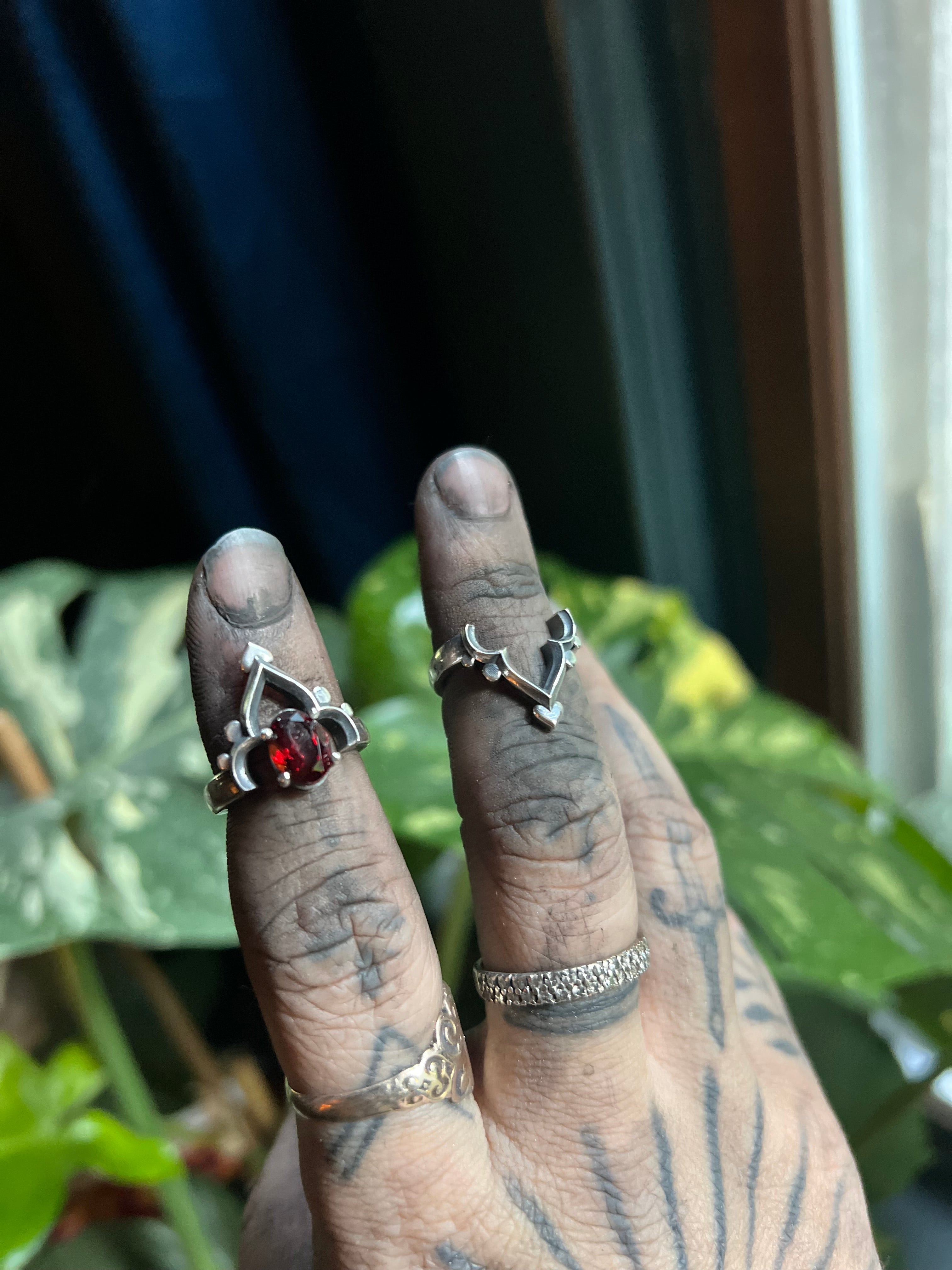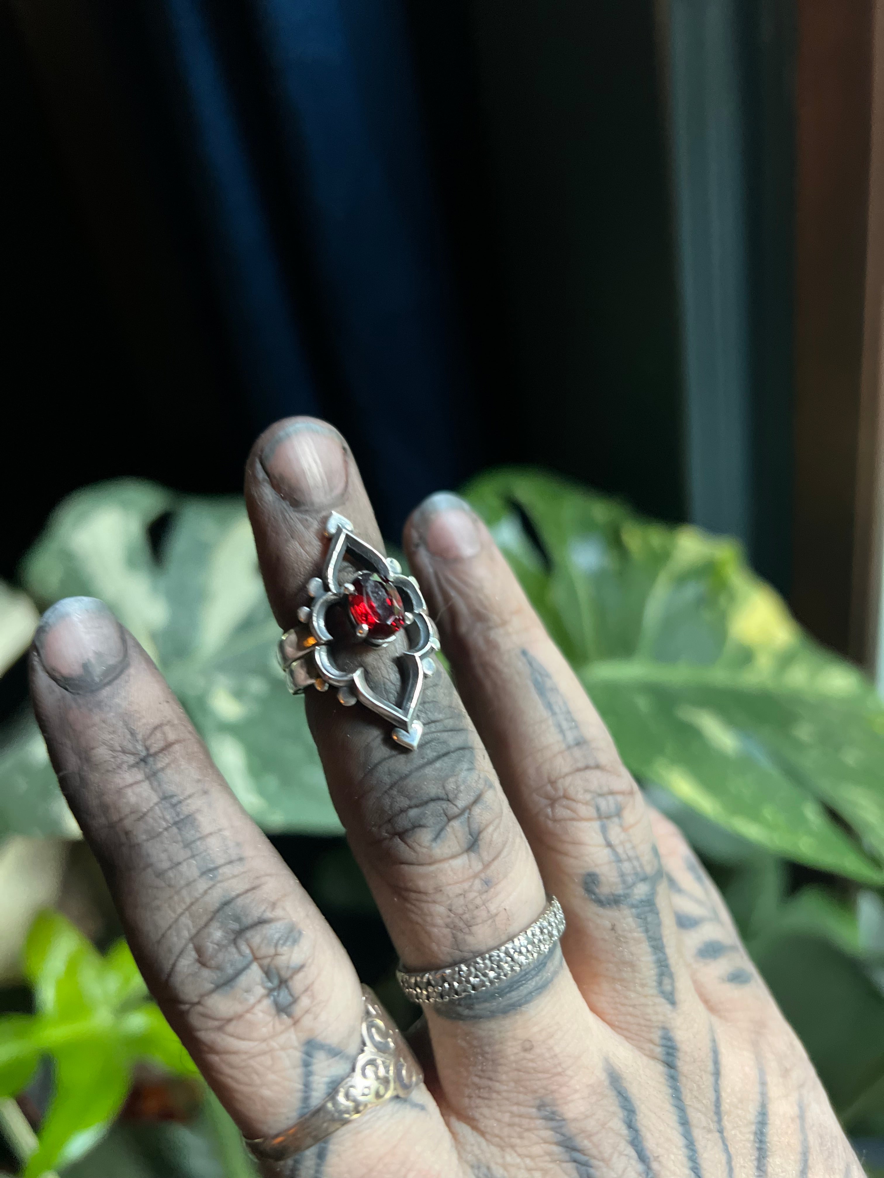this is made to order- please allow 4-6 weeks This is a Cathedral inspired rings. This one comes with an 8x6 garnet stone-